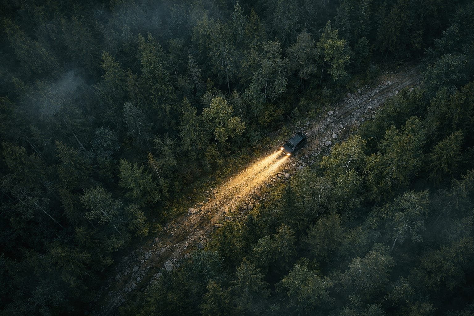 The car growls low, moving with quiet urgency as we leave the tar road. Trees crowd the pathway. No sign of civilisation—no houses, no lights, not even the faint glow of a village. Only the occasional banyan tree looming suddenly in the dark.