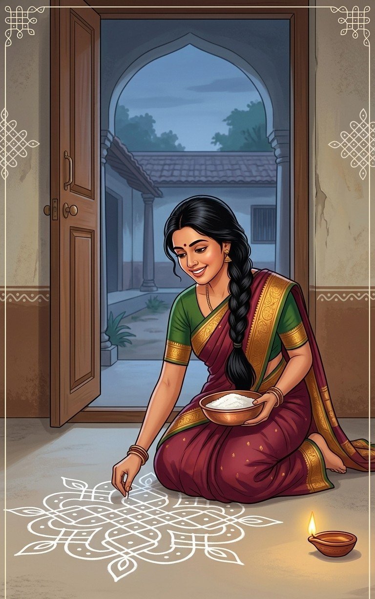 In the wee hours, when most children of this digital era would have just gone to sleep, this woman in her fifties, Meenakshi, was up and about. Armed with a bowl of rice powder, you would find her there at the threshold of her house, her saree tucked a little on the left and her braid hurriedly fitted into a bun. The neat cement flooring was her canvas, her artwork a meditation! A perfect ‘me time’.